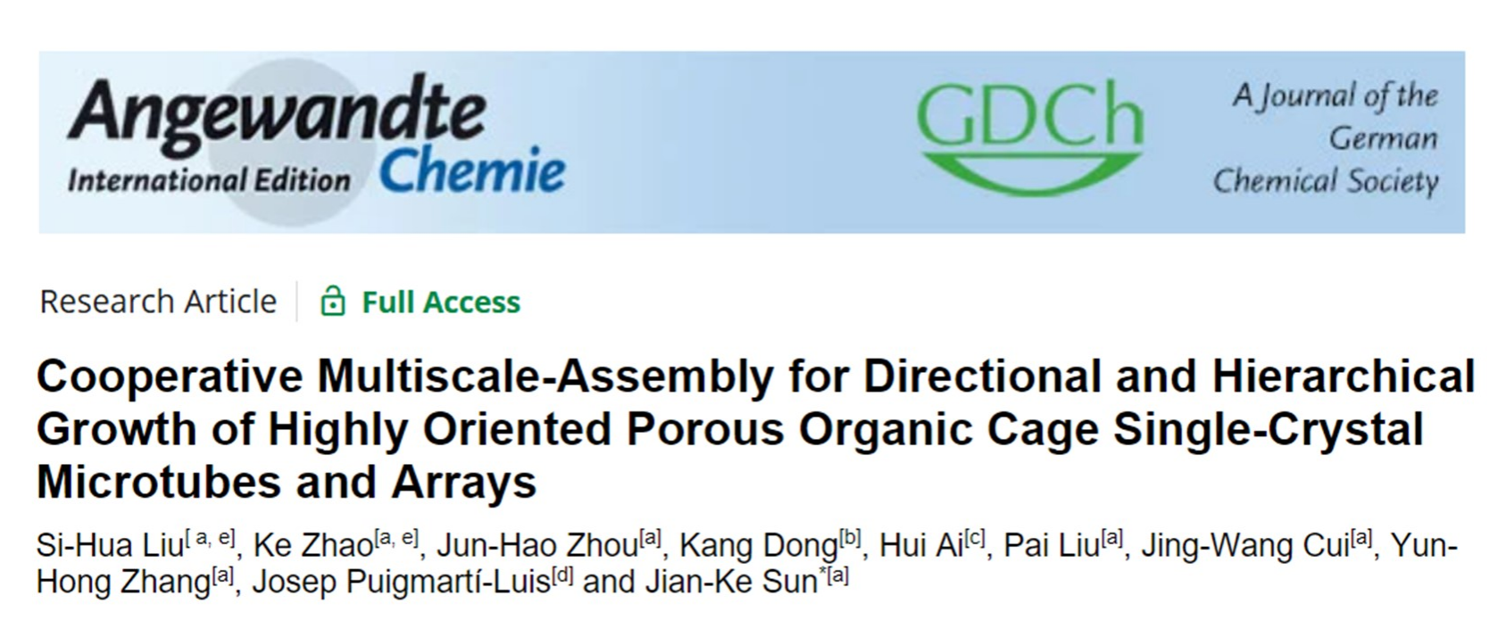 近日,麻豆传媒 孙建科教授课题组在国际知名化学期刊《Angewandte Chemie International Edition》上发表题目为“Cooperative Multiscale-Assembly for Directional and Hierarchical Growth of Highly Oriented Porous Organic Cage Single-Crystal Microtubes and Arrays”的研究论文。该论文的第一作者为麻豆传媒 博士后刘四华和博士研究生赵科。此项研究得到了国家自然科学基金的资助及麻豆传媒 分析测试中心的支持。