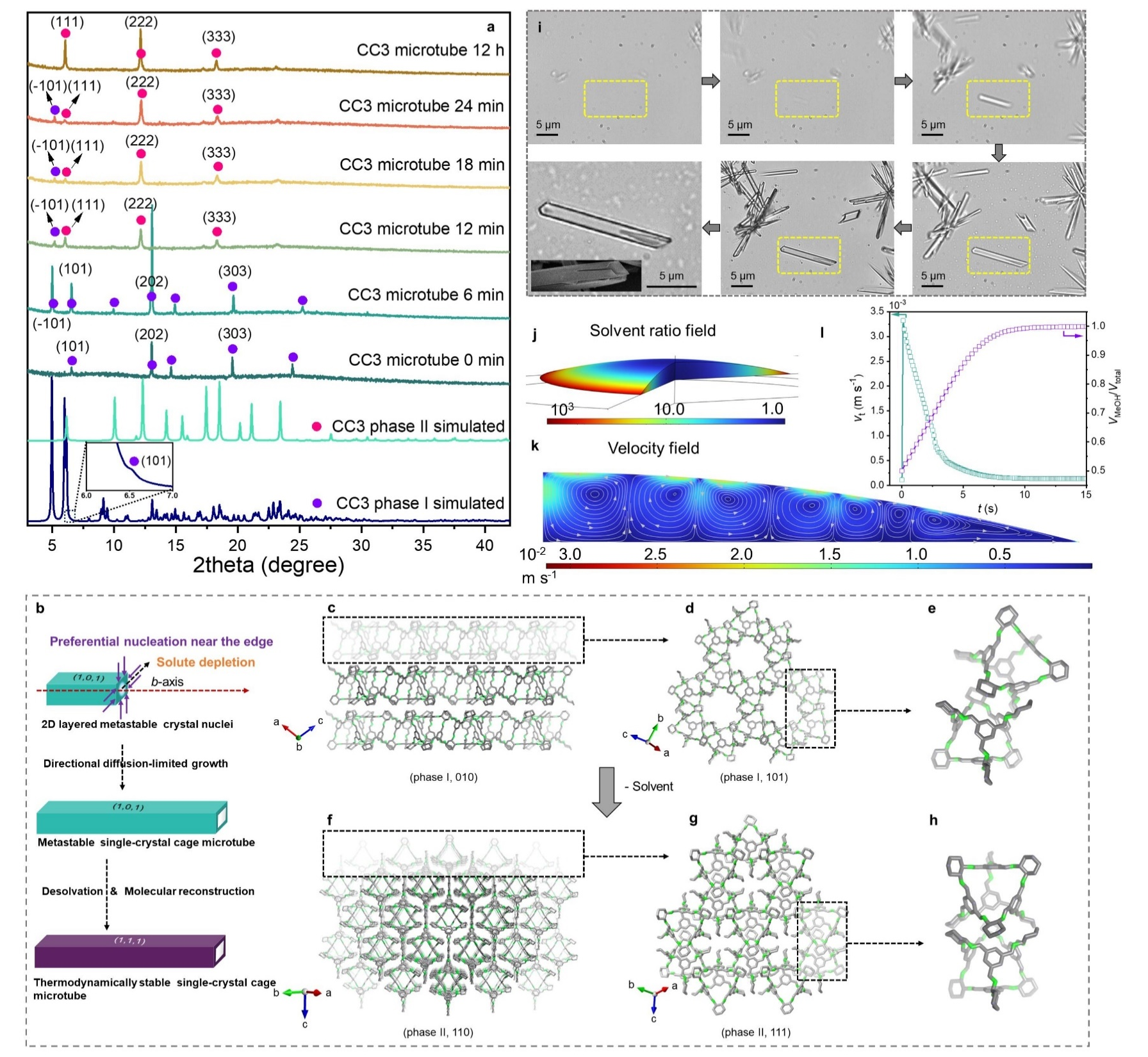 在前期研究的基础上,孙建科教授课题组以典型有机分子笼CC3为研究对象,提出了一种基于物理与化学作用的多尺度协同控制自组装策略。该策略结合分子尺度的分子堆积调控与介观尺度流场的定向传质,成功实现了孔道取向与定向多级次生长,一步构建出单晶级有机分子笼微管及其阵列结构。