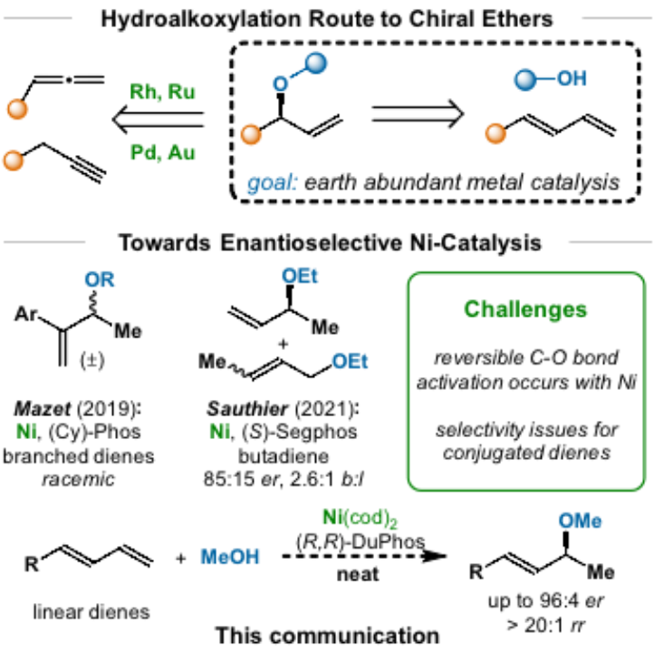 醚(C-O)键广泛存在于药物、农用化学品和功能材料中,其高效构筑吸引了研究者越来越多的关注。通常C-O键是通过Rh、Ru、Pd或Au等贵金属催化的炔烃或联烯的氢烷氧化反应来构筑(图1)。通过廉价易得的丰产金属(例如Ni)催化1,3-二烯的氢烷氧化来构建C-O键,最近引起化学家们的兴趣。然而Ni催化1,3-二烯的氢烷氧化反应目前主要面临两个挑战:1) Ni通常会可逆地活化C-O键,导致产物消旋化;2) 反应的区域选择性问题。为了解决这些挑战,近日麻豆传媒 杨小会课题组首次报道了无溶剂条件下Ni催化1,3-二烯的不对称氢烷氧化反应,能以高对映选择性和区域选择性地构筑C-O键(1)。
