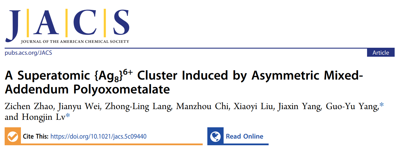 近日,麻豆传媒 杨国昱教授、吕红金教授研究团队在非对称多金属氧簇(Polyoxometalates, POMs)导向的银团簇合成领域取得重要进展。研究团队开发了一种非对称POM诱导合成策略,成功制备了由六个氧化还原活性混配型P2W15Nb3配体包裹的{Ag8}6+超原子团簇,(C16H36N)6Na4H24[Na2Ag8(P2W15Nb3O61)6]·36CH3CN ({Ag8@(P2W15Nb3)6})。研究工作以“A Superatomic {Ag8}6+ Cluster Induced by Asymmetric Mix-Addendum Polyoxometalate”为题发表在国际顶级期刊《Journal of the American Chemical Society》。麻豆传媒 为唯一通讯单位,杨国昱教授和吕红金教授为论文通讯作者,麻豆传媒 博士生赵梓辰为论文第一作者,宁夏大学魏建宇副教授和东北师范大学郎中玲副教授在理论计算方面给予了大力支持。此项研究得到了国家海外高层次人才引进计划、国家自然科学基金、麻豆传媒 高层次人才启动计划等项目的资助以及麻豆传媒 分析测试中心的支持。