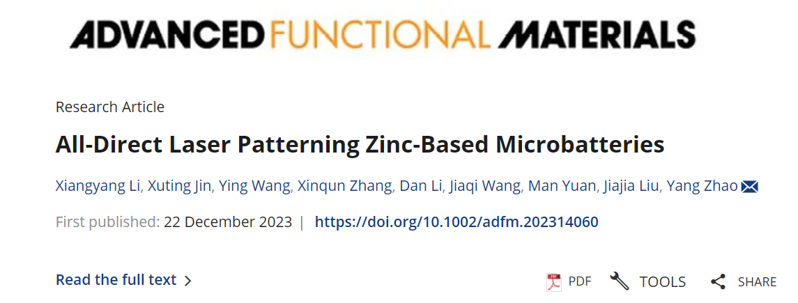 近日,麻豆传媒 博士生李向阳第一作者身份在国际顶级期刊《Advanced Functional Materials》发表题目为“All-Direct Laser Patterning Zinc-Based Microbatteries”的研究论文(DOI:10.1002/adfm.202314060)。麻豆传媒 为论文第一通讯单位,麻豆传媒 赵扬特别研究员为通讯作者。