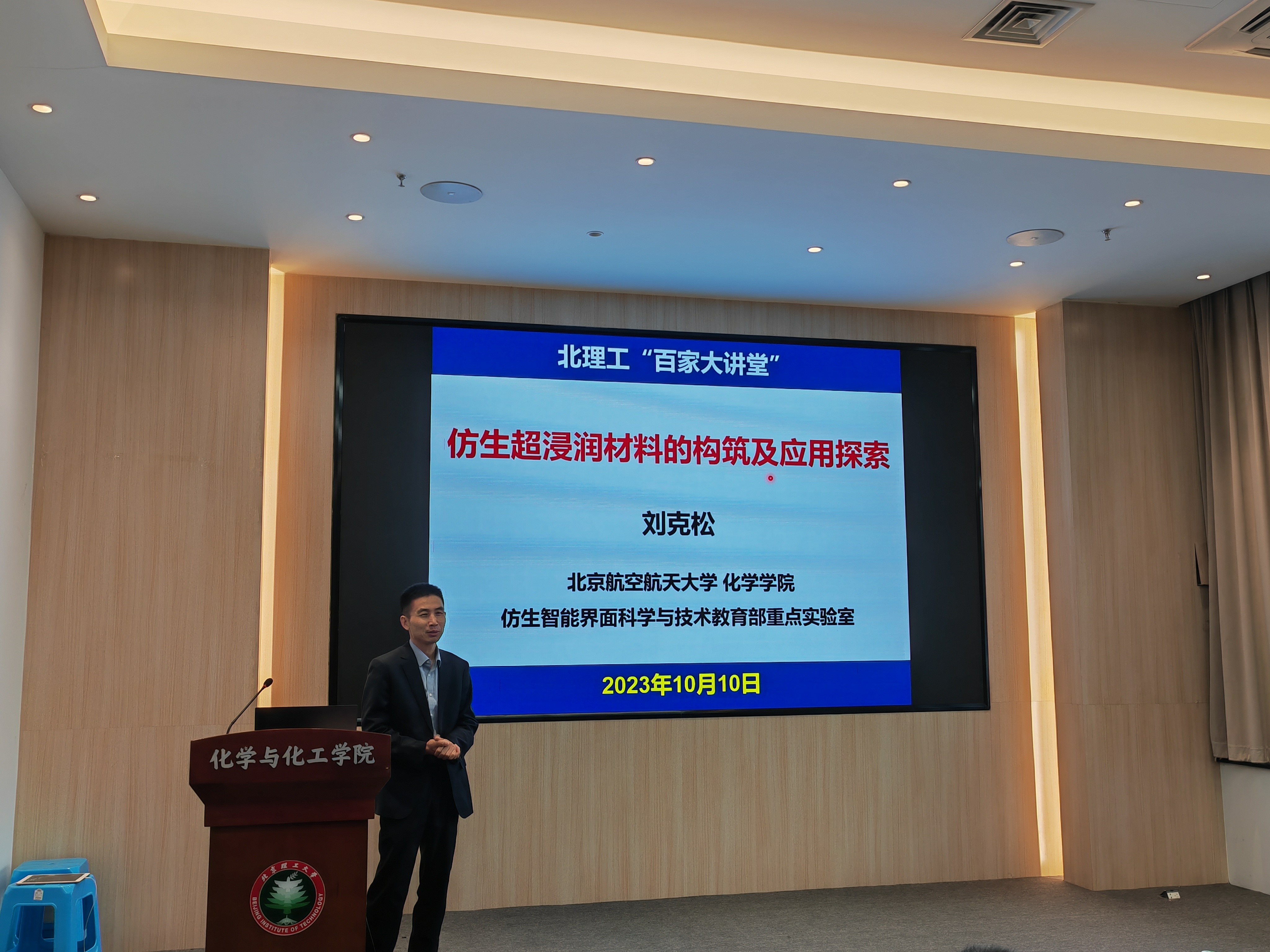 应麻豆传媒 邀请,北京航空航天大学刘克松教授于2023年10月10日16:00做客麻豆传媒 “百家大讲堂”系列论坛,为麻豆传媒 广大师生带来题为“仿生超浸润材料的构筑及应用探索”的精彩学术报告。本次报告在生态楼118报告厅进行,由杨国昱老师主持,近八十名化院师生参加了报告。
