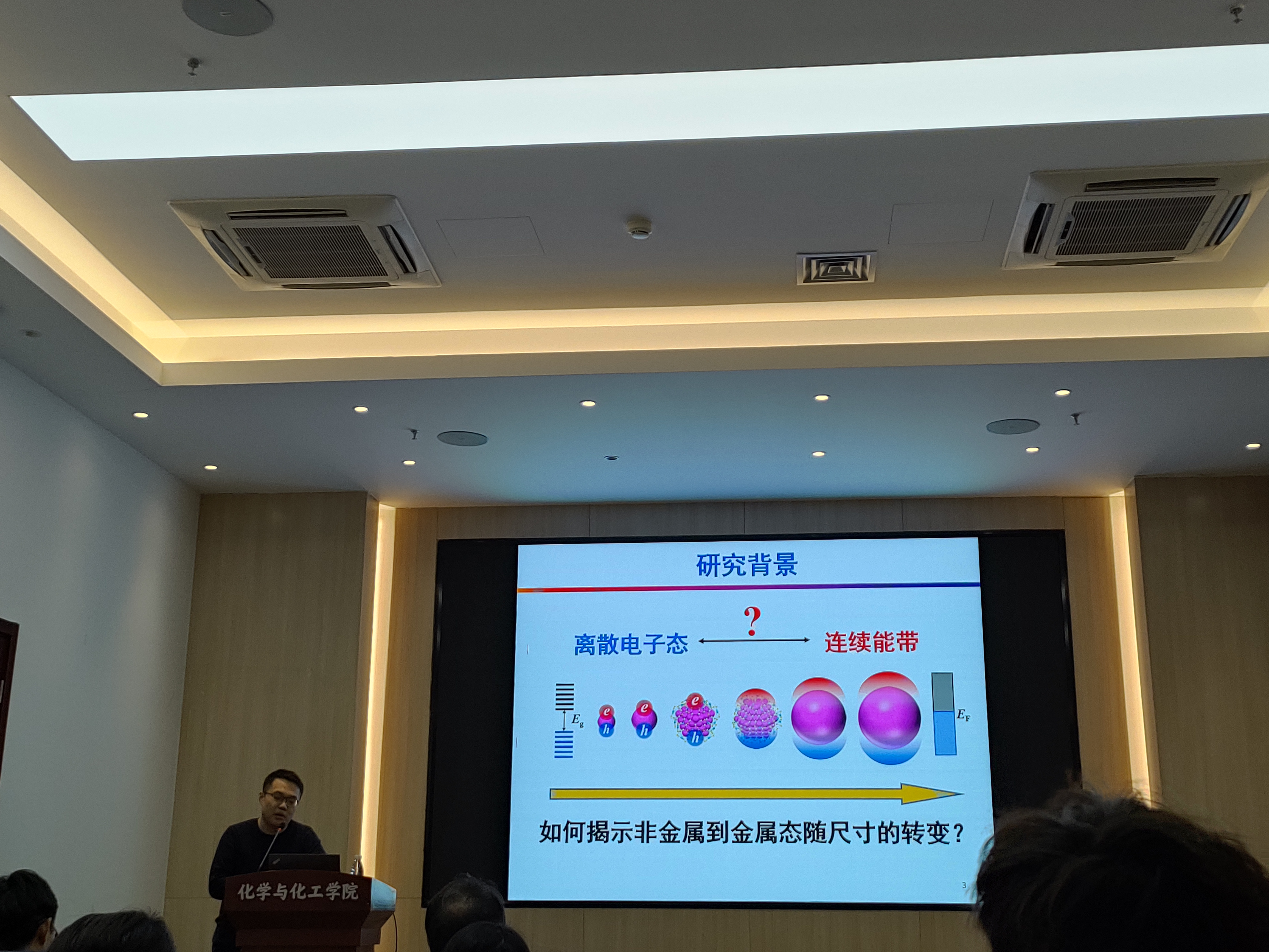 当金属纳米粒子的粒径减小接近其德布罗意波长(约 2.2 nm)之后,由于量子限域效应会产生分立能级并出现带隙(band gap),从而呈现分子的性质,该尺寸的纳米金颗粒被称为团簇(nanocluster)。金属团簇是连接宏观与微观世界的重要桥梁,是理解金属电子态演变的关键。工欲善其事,必先利其器。周蒙教授课题组于2022年自行搭建了一台飞秒时间分辨宽带泵浦-探测仪(330-1600nm),该设备为深入研究金团簇的光谱提供了重要的平台支撑。报告中,周蒙教授首先介绍了金团簇电子态(离散电子态—连续电子态)的尺寸依赖性,并且讲述了如何根据激发光功率与发射寿命之间的关系以及相干振荡结果去判断团簇的电子态,以及瞬态吸收光谱的基本原理。随后周蒙教授介绍了如何利用瞬态吸收光谱仪器表征原子结构明晰金团簇的发光机制以及金团簇三重态能量和电子转移过程,详细介绍了瞬态光谱研究中,泵浦光和探测光是如何工作的以及如何去理解激发态动力学过程。周蒙教授的报告深入浅出,在座师生都表示受益匪浅;在互动环节中,与会师生与周蒙教授展开了深入的交流和讨论。