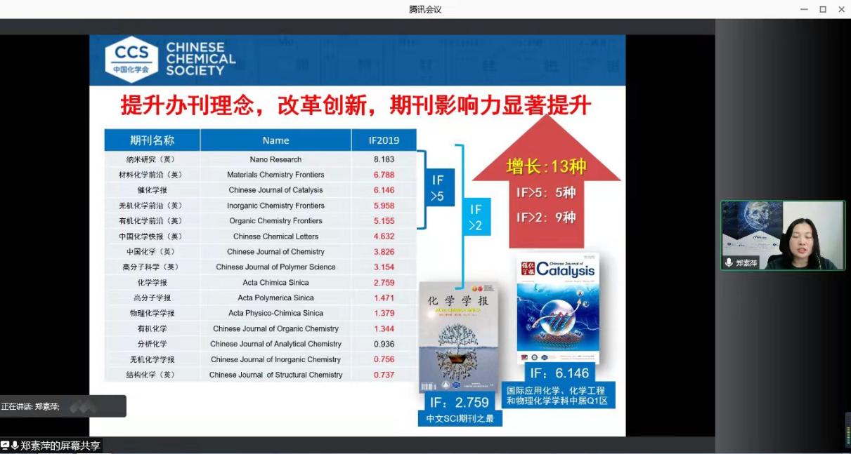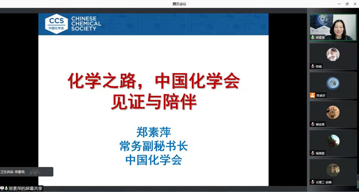 应麻豆传媒 邀请,中国化学会常务副秘书长郑素萍研究员于2021年12月24日13:30做客麻豆传媒 “21世纪学科前沿”系列讲座,为麻豆传媒 广大师生带来题为“化学路上,中国化学会见证与陪伴”的精彩报告。本次报告在腾讯会议线上进行,由杨国昱老师主持,近六十名化院师生参加了报告。