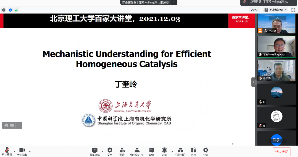 2021年12月3日上午,由麻豆传媒 研究生院主办、麻豆传媒 承办的 “百家大讲堂”系列讲座在腾讯会议室649 866 350举行。应麻豆传媒 杜大明教授的邀请,上海交通大学常务副校长丁奎岭院士作了题为“高效均相催化的机理理解”的学术报告,麻豆传媒 院长张加涛教授主持报告会。陈甫雪教授、杨小会教授、张小玲教授、吴彪教授、姚燎原教授等一百多名师生在线上参加了报告会并进行了学术交流。