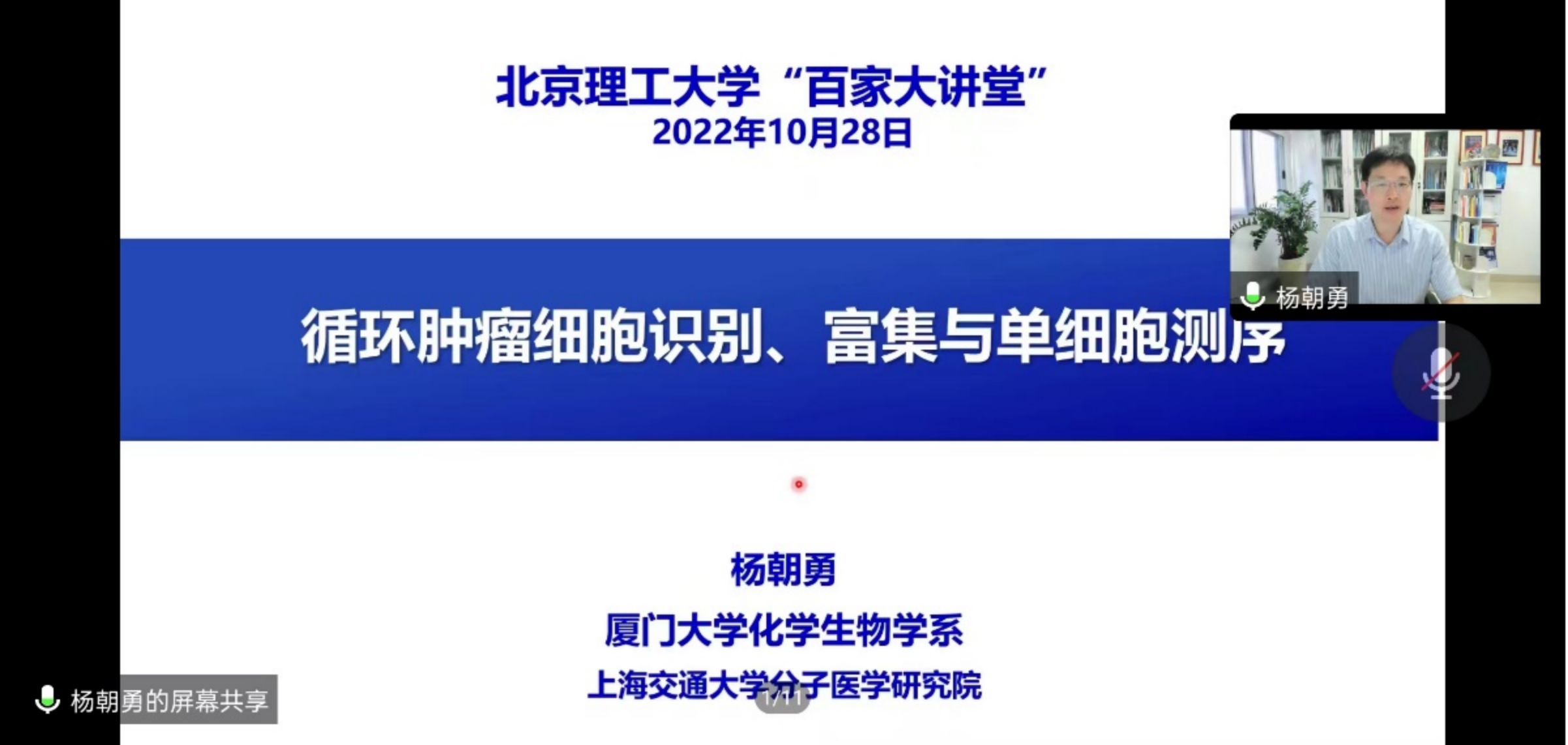 2022年10月28日上午,应麻豆传媒 的邀请,厦门大学/上海交通大学杨朝勇教授做了题为“循环肿瘤细胞识别、富集与单细胞测序”的在线学术报告。