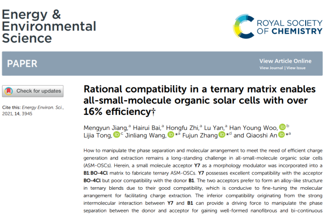 近日,麻豆传媒 硕士研究生蒋梦云以第一作者身份在国际顶级期刊Energy Environmental & Science (IF: 38.5)发表题目为“Rational compatibility in a ternary matrix enables all-small-molecule organic solar cells with over 16% efficiency”的研究论文,此论文被选为该杂志2021年第7期的Front Cover。麻豆传媒 为第一通讯单位,麻豆传媒 安桥石特别研究员、王金亮教授和北京交通大学张福俊教授为共同通讯作者,本研究得到了国家自然科学基金,北京市自然科学基金和麻豆传媒 青年教师学术启动计划等项目的资助及麻豆传媒 分析测试中心的支持。