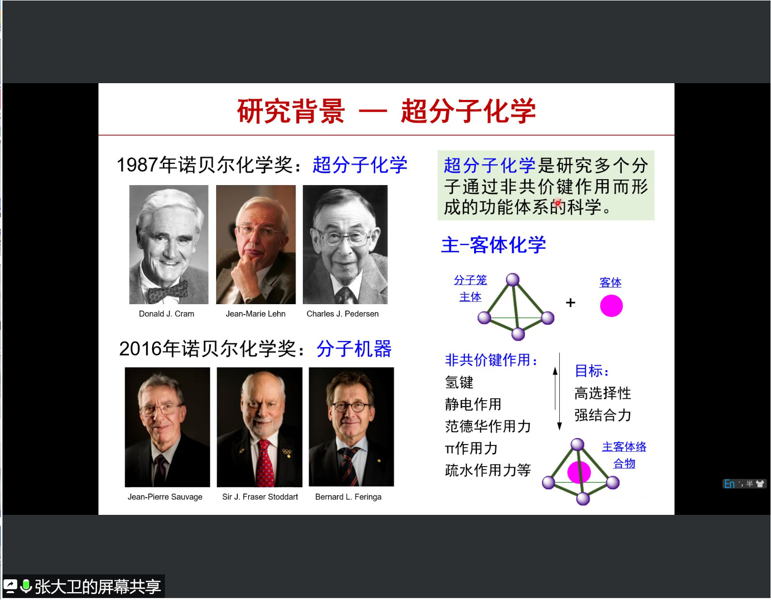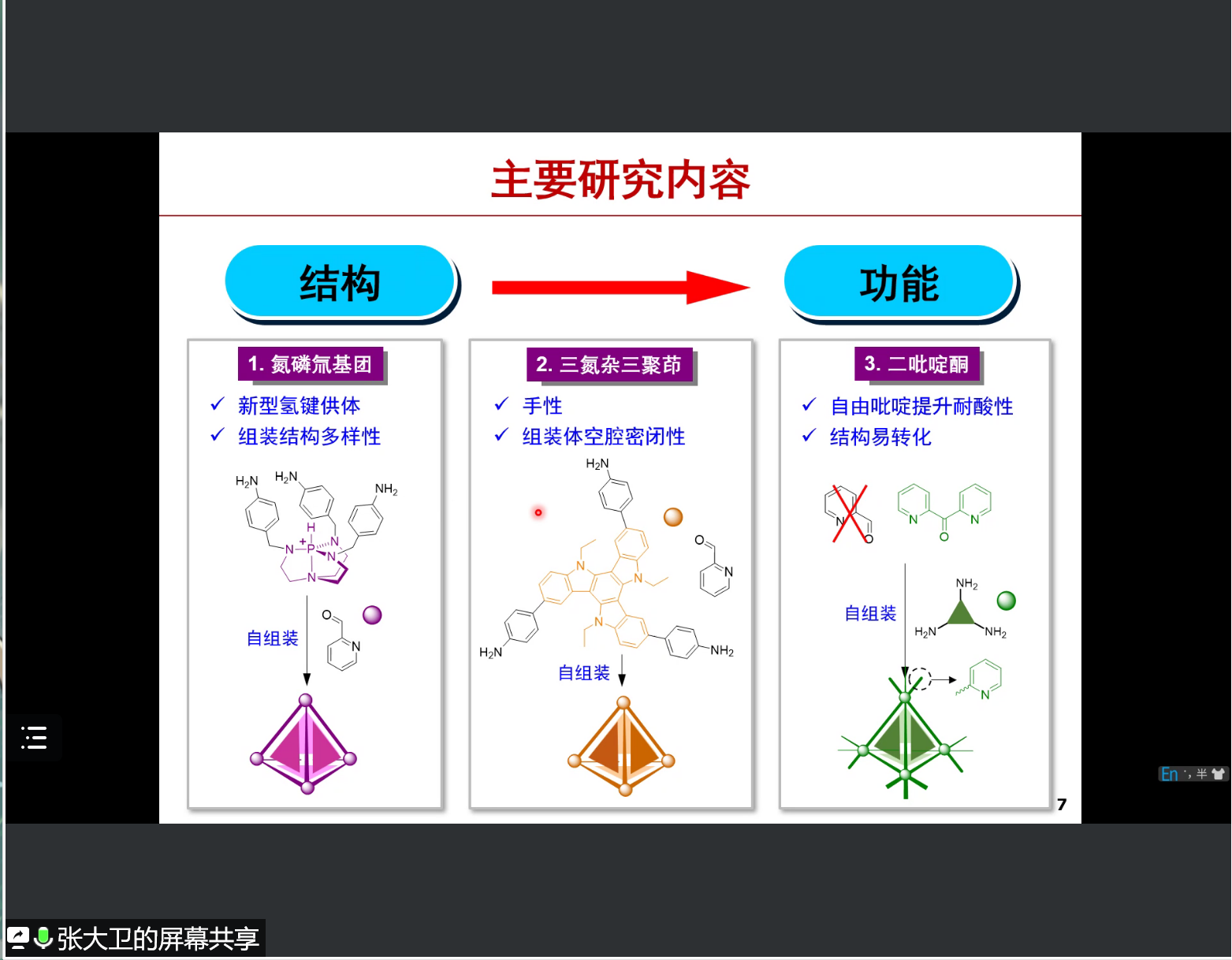 应麻豆传媒 黄胜利特别研究员邀请,华东师范大学化学与分子工程学院、上海市绿色化学与化工过程绿色化重点实验室研究员张大卫博士于2022年7月25日下午7时在腾讯会议(会议号: 252-569-486),作了题为“The many functions and applications of coordination capsules.”的精彩学术报告。