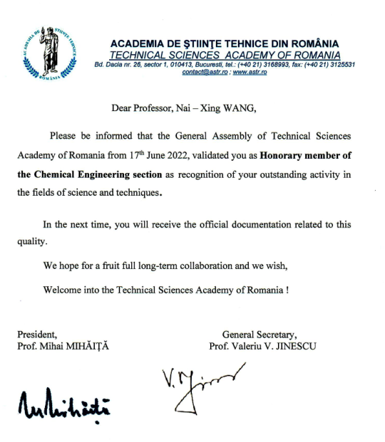近日,欧洲罗马尼亚技术科学院正式公布2022年增选院士结果,我校化工与材料学院93级校友中国科学院理化技术研究所王乃兴研究员当选罗马尼亚技术科学院院士。