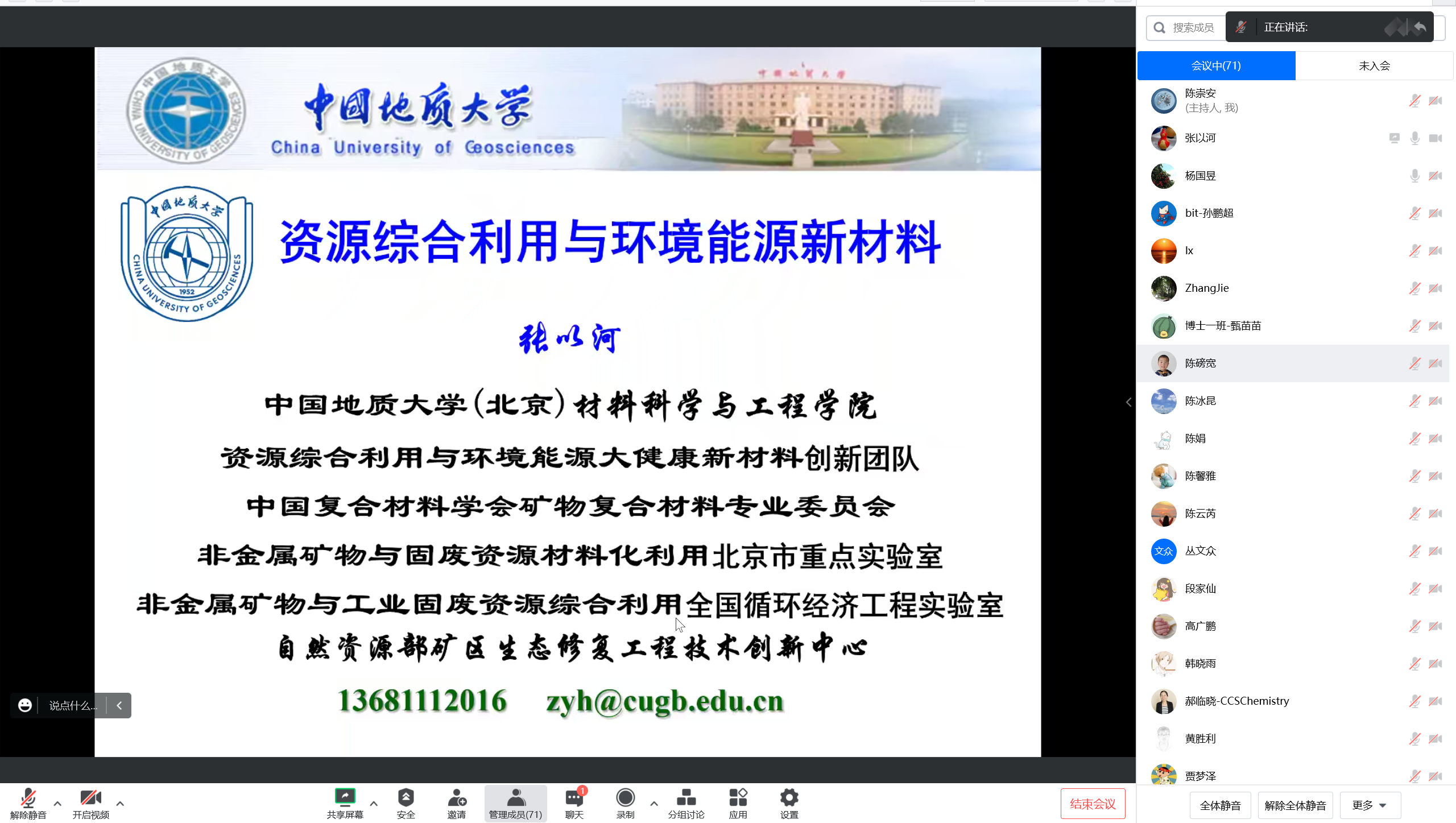 张以河教授首先向介绍了伴随着人类文明进步,各类材料的发展趋势,在当前“碳达峰,碳中和”的大背景下,自然资源综合利用与矿物复合材料的开发是面向资源,生态环境并符合新材料的国家战略需求。接着张以河教授重点介绍了课题组在矿物/高分子功能复合材料(面向国家重大需求),石墨烯与矿物复合光催化材料在环境能源上的应用(面向世界材料科技前沿和健康)和尾矿复合材料及生态环境应用(面向国家经济主战场)三个领域的研究进展。最后张以河教授介绍了自己在各类新能源材料与生态环境材料领域始终面向国家战略需求的科教融合经历。