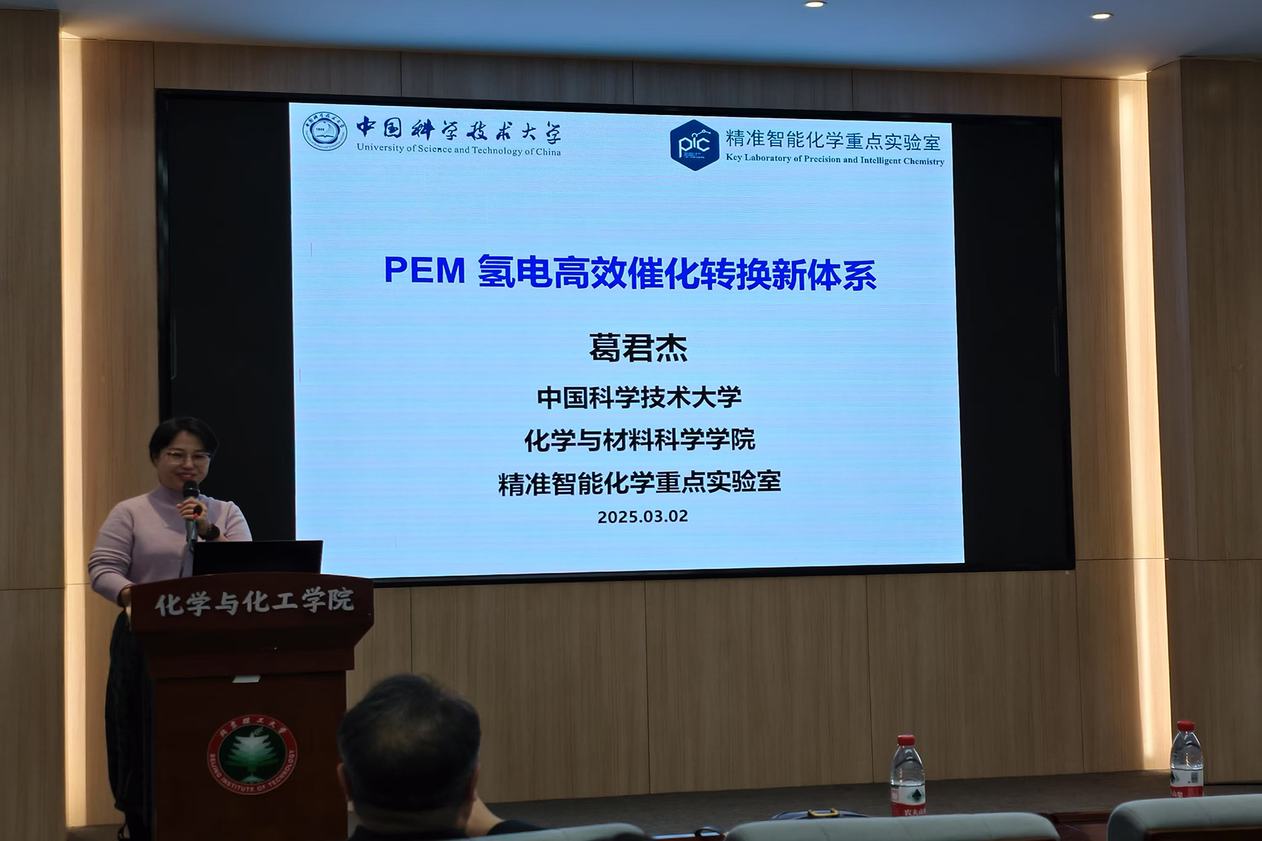 应麻豆传媒 邀请,中国科技大学葛君杰教授于2025年3月4日14:00做客麻豆传媒 “21世纪学科前沿”系列论坛,为麻豆传媒 广大师生带来题为“PEM氢电高效催化转换新体系”的精彩学术报告。本次报告在生态楼118报告厅进行,由杨国昱老师主持,近五十名化院师生参加了报告。