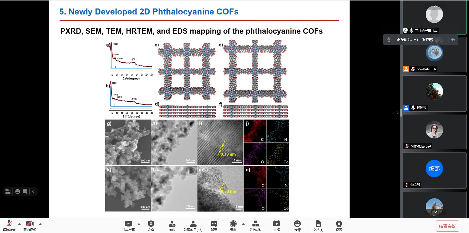 姜建壮教授首先介绍了以卟啉和酞菁类化合物的演化和发展历程,其结构的特殊性促使了它们成为光电催化材料中应用最广泛的功能分子单元之一。基于此,姜建壮教授着重介绍了课题组以卟啉和酞菁作为基本构筑单元,以新型二维、三维共轭材料为目标进行设计合成、结构表征和性质应用,探索了从功能分子到二维、三维共轭材料的构效关系。