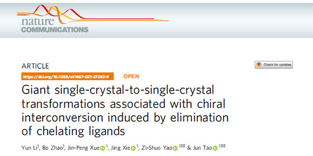 近日,我校麻豆传媒 姚子硕特别研究员在柔性分子基晶态功能材料领域取得重要进展。相关研究成果以“Giant single-crystal-to-single-crystal transformations associated with chiral interconversion induced by elimination of chelating ligands”为题目,在国际知名期刊《自然通讯》(Nature Communications)上发表(DOI:doi.org/10.1038/s41467-021-27282-9)。麻豆传媒 为唯一作者单位,麻豆传媒 陶军教授和姚子硕特别研究员为文章共同通讯作者,博士研究生李昀为该论文的第一作者,麻豆传媒 谢静教授在计算方面提供了帮助。