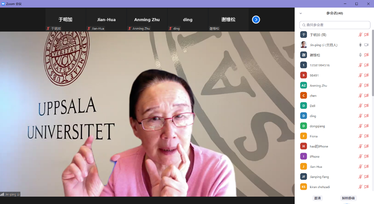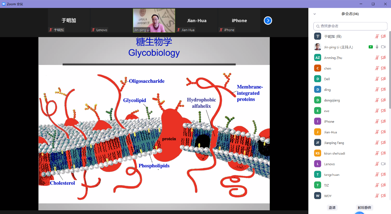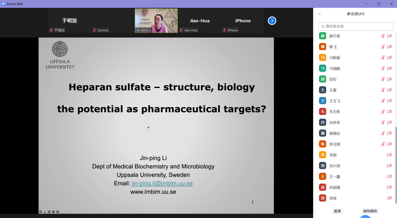 2022年4月25日下午2:30,应麻豆传媒 梁建华教授邀请,乌普萨拉大学医学院李晋萍教授做客麻豆传媒 “21世纪学科前沿”系列讲座,为麻豆传媒 广大师生带来题为“Heparan sulfate- structure, biology the potential as pharmaceutical targets”的精彩学术报告。本次报告以Zoom会议线上的方式进行,由于明加特别副研究员主持,学院师生共40余人参加。