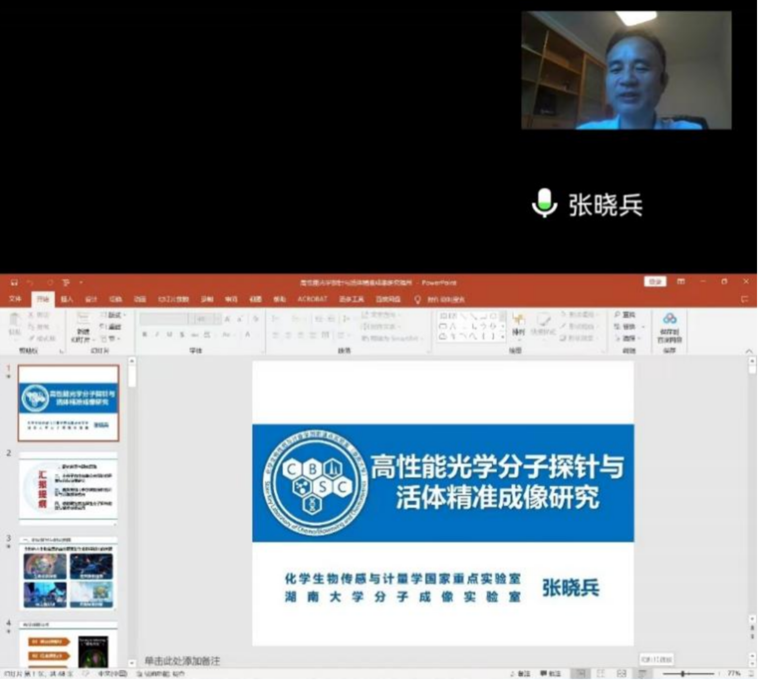 的邀请,湖南大学张晓兵教授做了题为“荧光探针结构调控与精准成像研究”的在线学术报告。