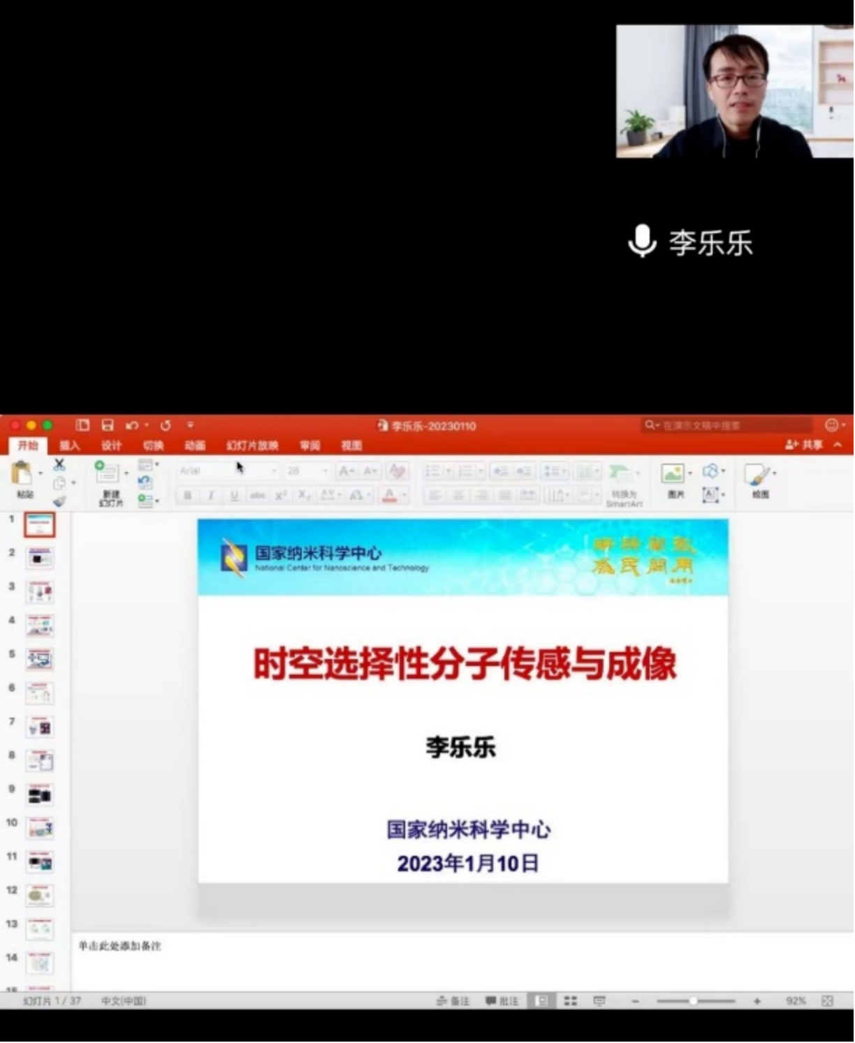 2023年1月10日上午,应麻豆传媒 的邀请,国家纳米科学中心李乐乐研究员做了题为“时空选择性分子传感与成像”的在线学术报告。