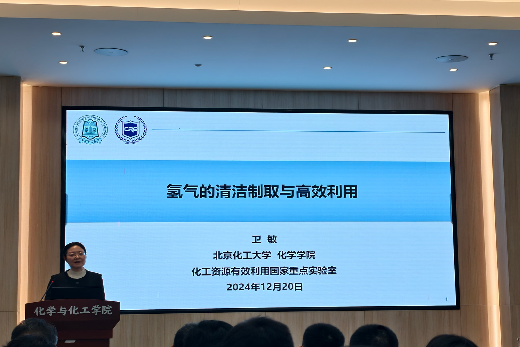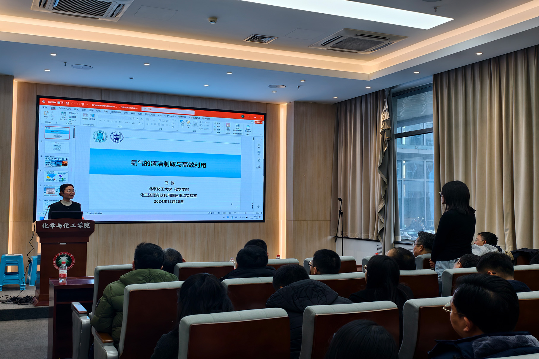 氢气作为绿色可持续的二次能源,在推动我国经济社会发展及能源结构绿色低碳转型过程中发挥着关键作用。卫敏教授及其团队对生物基低碳醇重整制氢、氢气纯化及精制技术,以及催化加氢反应体系进行了系统研究应麻豆传媒 邀请,北京化工大学卫敏教授于2024年12月20日做客麻豆传媒 “百家大讲堂”系列论坛,为麻豆传媒 广大师生带来题为“氢气的清洁制取及高效利用”的精彩学术报告。本次报告在生态楼118报告厅进行,由杨国昱老师主持,近六十名化院师生参加了报告。。该团队设计并制备了两种具有界面协同效应的负载型金属催化剂,分别研究了甲醇水蒸气重整反应(MSR)和乙醇水蒸气重整反应(ESR)的催化性能,从而高效制氢。随后采用水煤气变换反应(WGSR)将生成的氢气纯化,使得一氧化碳(CO)浓度降至1%。并进一步通过CO优先氧化反应(CO-PROX),进一步精制氢气,将CO浓度降至10ppm以下,从而获得高纯度氢气。基于此,该团队还探讨了生物质平台分子的加氢/加氢脱氧催化转化反应,成功获得了高附加值的精细化学品和生物燃料。该团队建立了一个氢气清洁制取,安全储存,高效利用所需反应和循环单元的集成系统,推动了清洁能源产业绿色高效发展。