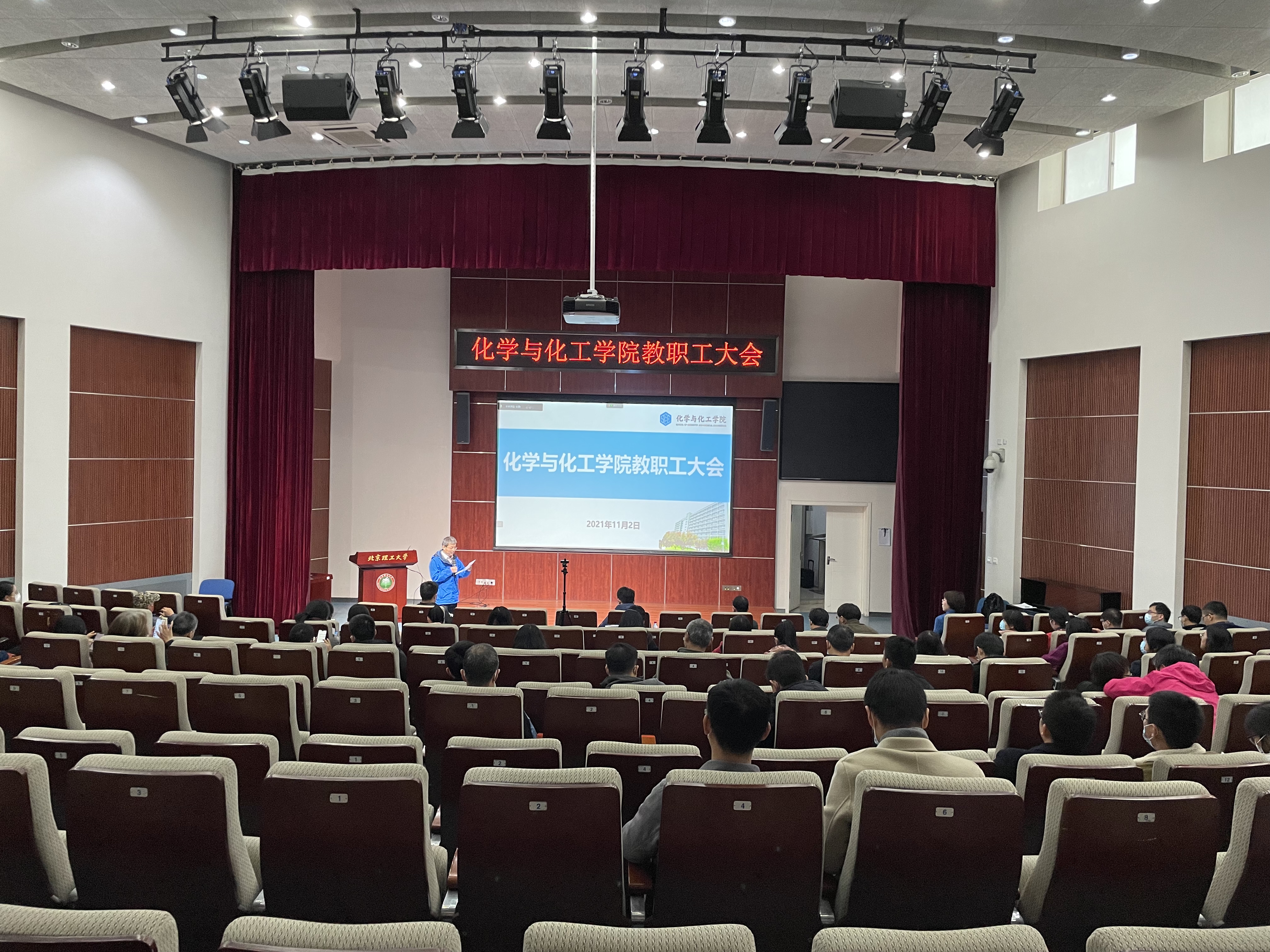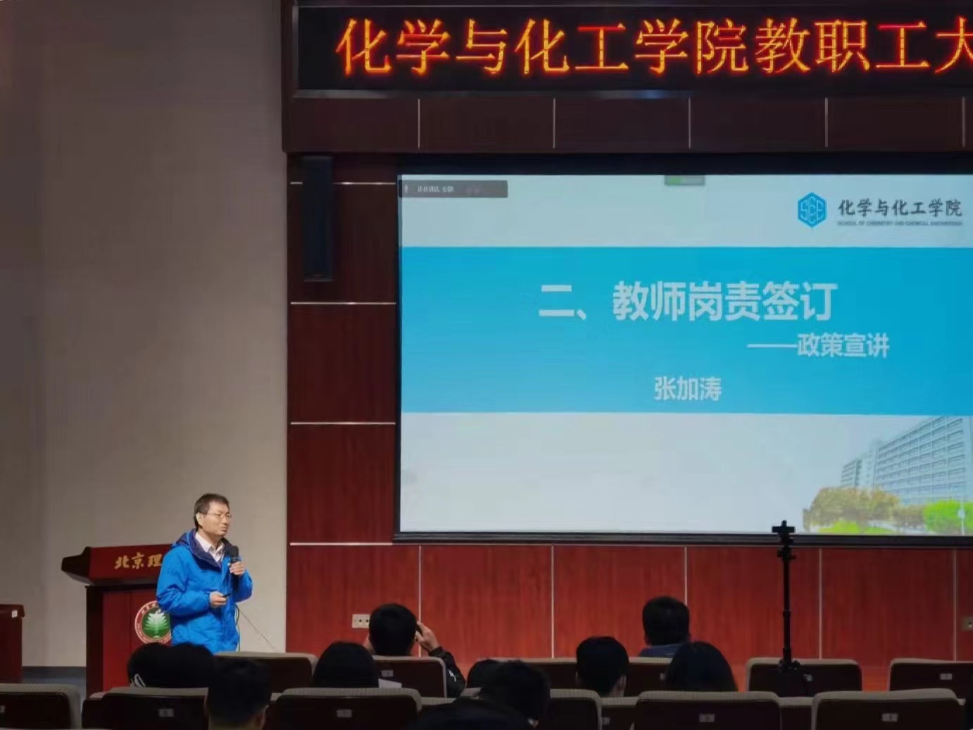 在良乡校区综合教学楼报告厅召开全院教职工大会,会议就学院安全生产工作、教师岗责签订工作、论文认领工作等进行了部署。会议采取线上、线下方式同步进行。大会由院长张加涛主持。