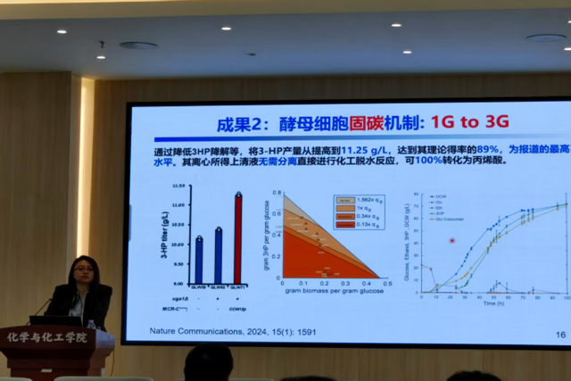 刘子鹤教授对酵母细胞固碳机制进行讲解,将细胞生长过程中产生的CO2转化为3-HP,从而提高酵母细胞葡萄糖得率。