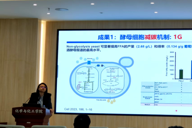 刘子鹤教授对酵母减碳机制进行讲解,通过改变酵母细胞糖酵解利用比例,实现CO2的减少排放,并以脂肪酸的合成为例,证明Non-glucolysis yeast可以提高脂肪酸的产量。