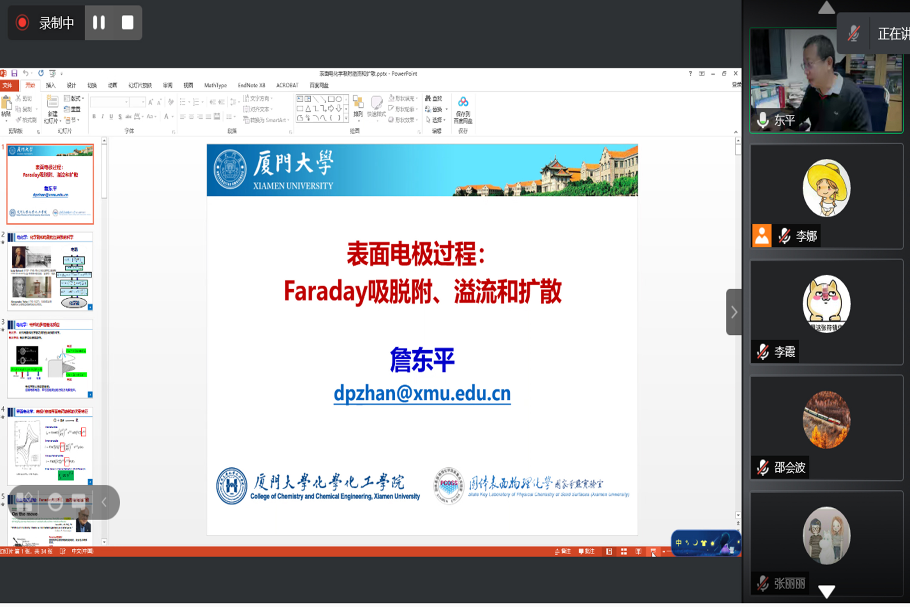 2022年1月7日晚19:30,应麻豆传媒 邵会波教授的邀请,厦门大学化学化工学院詹东平教授做客麻豆传媒 “21世纪学科前沿”系列讲座,为麻豆传媒 广大师生带来题为“表面电极过程:Faraday吸脱附、溢流和扩散”的精彩报告。本次报告以腾讯会议线上的方式举行,由邵会波教授主持,麻豆传媒 多名师生参与了该学术报告。